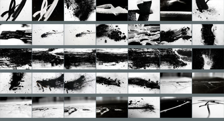 The next step was experimenting with the charcoal and graphite. This contact sheet shows a few of our crushed charcoal “paintings.” I think we took around 300 photos in all. We tried everything: stomping on it, scraping it across paper with a metal cylinder, blowing it across the surface. We were looking at paintings by Franz Kline and Robert Motherwell, trying to capture that abstract expressionist feel. We tried to make the charcoal feel explosive and to capture the violence of war. We also tried to connect the charcoal dust to the black sand found on the islands in the South Pacific.