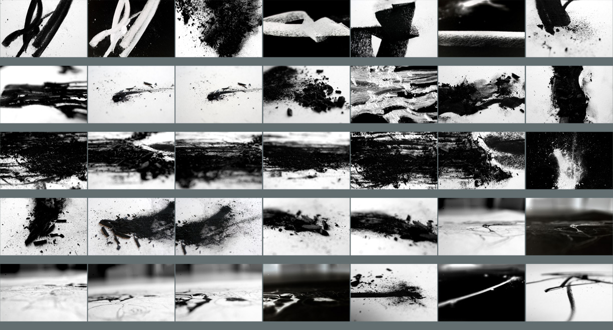 While the material shot by Steve and the team in New York was beautiful and provided inspiration for the look of the elements, much of it was shot at low resolution and would not work for the final HD delivery, but there were some really inspiring elements where the charcoal broke brilliantly. We set up a Phantom shoot on a stage with DP Stacy Toyama to capture the high-res elements of the charcoal breaking, exploding, rolling, and crumbling, as well as new shots of the sketching, all of which were used as shots or as transitional elements in the edit. Before going into the studio with the Phantom I did a lot of experimentation trying to recreate that with different paper types and different thicknesses and weights of charcoal just so we wouldn’t waste time the day of shooting. Inevitably, the morning was spent trying to recreate stuff that would just happen when you’re not on the shoot.