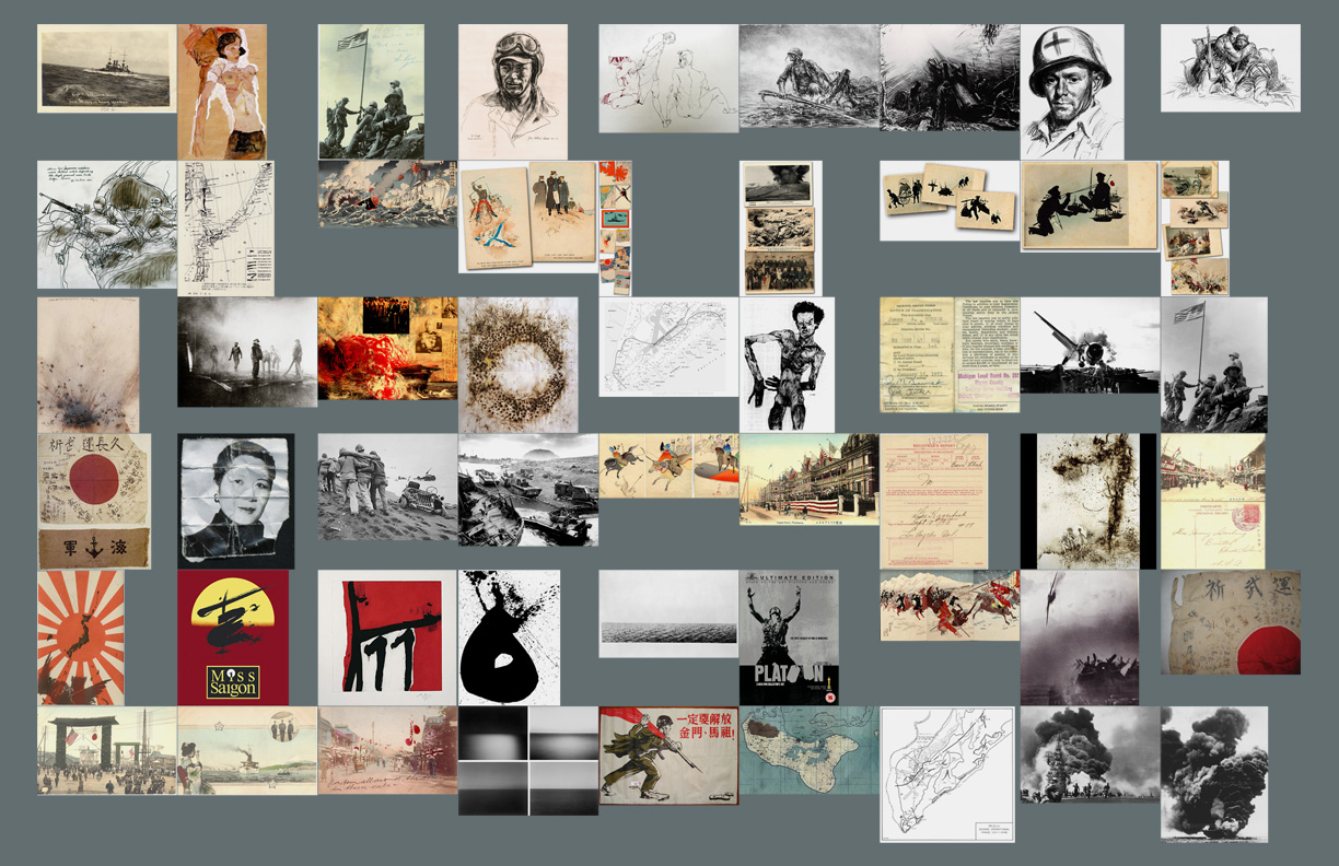 SF: We did a lot of research before we started – everything from drawings made by US soldiers to Japanese postcards… Egon Schiele, Cai Guo-Qiang’s gunpowder paintings, war posters, etc. War maps and military documents-influenced typography. You can also see where the color scheme comes from. I wanted to hint at the Japanese element so we looked at ink drawings and woodblock prints.
