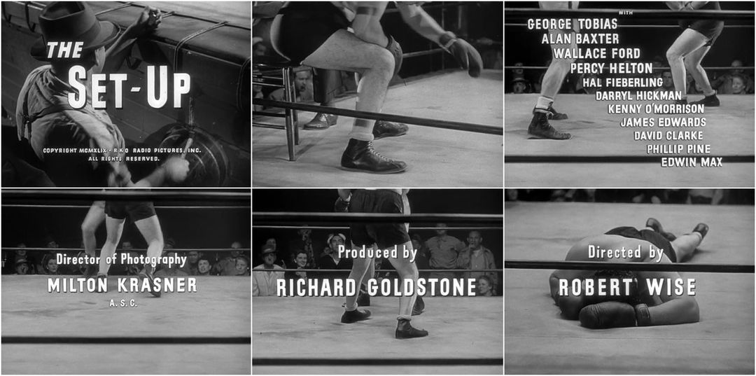 Viewer as spectator. Based on Joseph Moncure March's narrative poem, directed by Robert Wise, and shot by Milton Krasner, A.S.C., the cold opening title sequence to The Set-Up focuses solely on the legs of the combatants with Wise's credit framed by a fall. The unintelligible holler of the crowd serves as the only score.