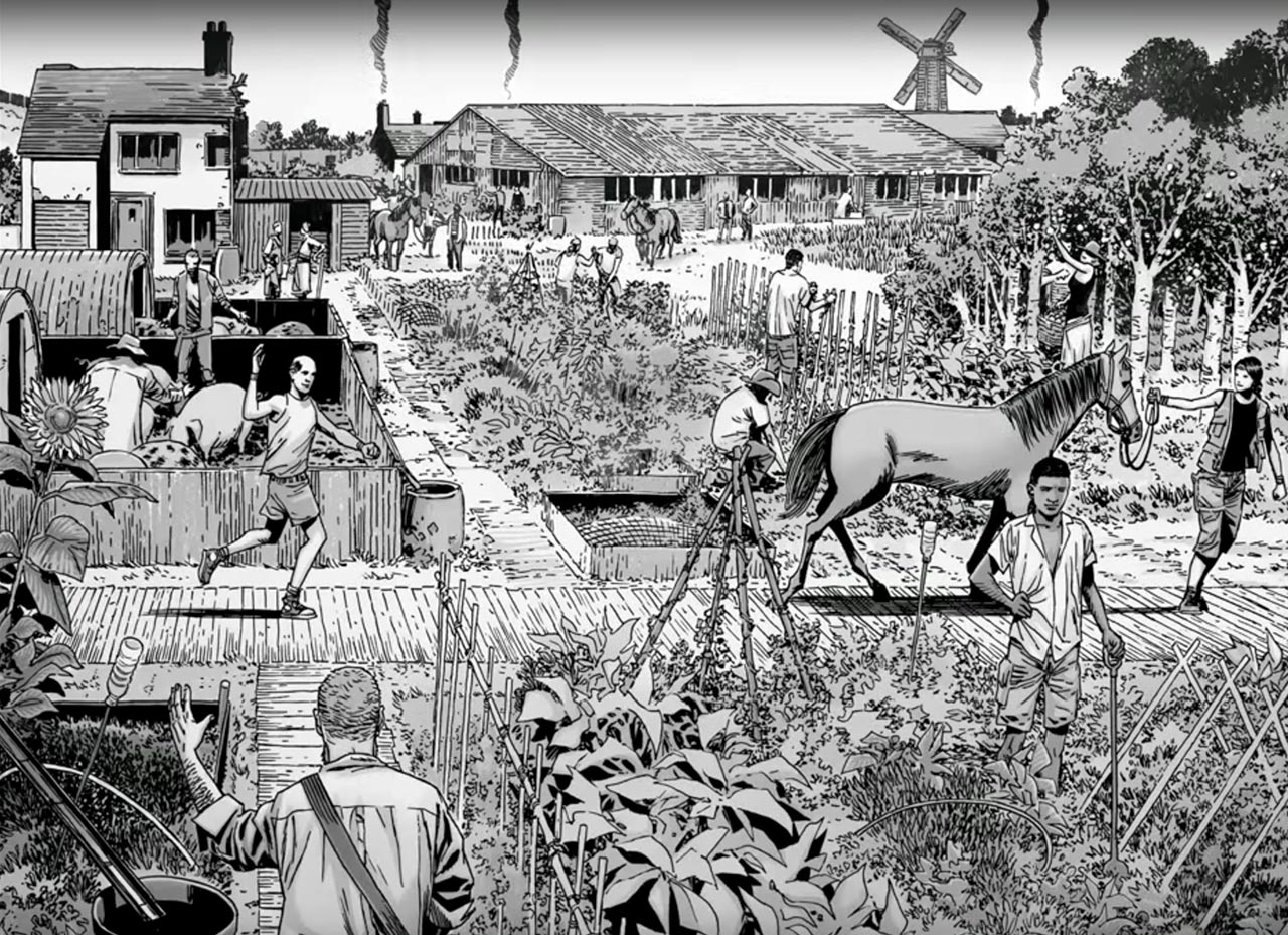 Tamsin: There is a particularly stand out image in the A New Beginning issue of the comic depicting Alexandria as a utopia. It shows everyone working to build this haven, growing vegetables, raising livestock and planting orchards and it just reminded us of the ranchers and settlers in frontier towns of the 19th century American West. The big skies and low angles of the Western genre became the main overarching influence of the concept.