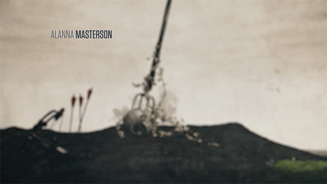 Angela: Of course, we do see a skull with a pitchfork through it and flowers vining out of it, so the general idea did make its way into the sequence. Other than talking about generals, I said we just wanted to see interesting pitches and Huge came back with three incredibly strong takes on the material and we started building it from there.