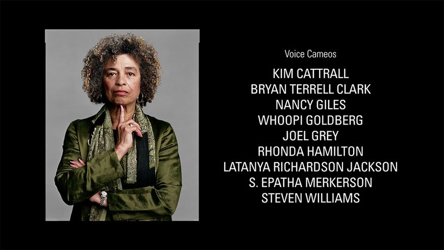Still from the end credits featuring a portrait of Angela Davis taken by Timothy Greenfield-Sanders
