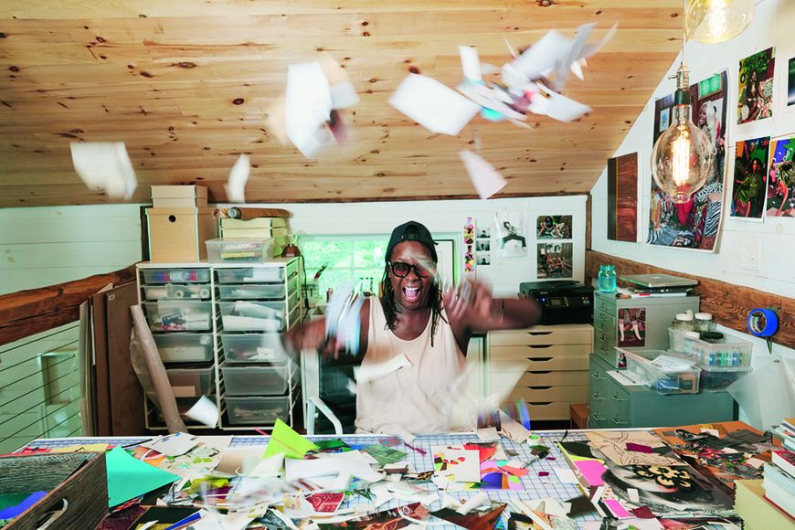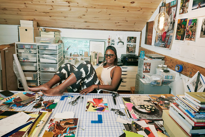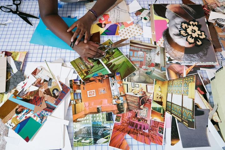 An overhead view of the desk of Mickalene Thomas featuring pieces of collage, including the artwork for Toni Morrison: The Pieces I Am.