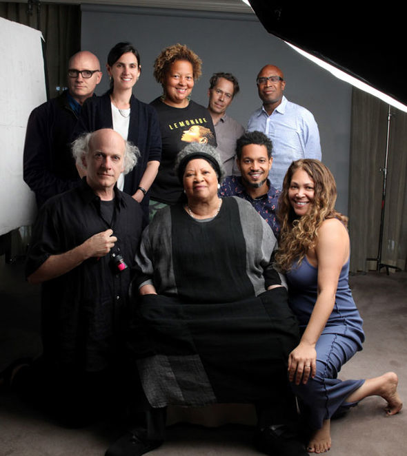 Toni Morrison and members of the documentary crew. Clockwise from left: Chad Thompson, Johanna Giebelhaus, Jackie Sanchez, Graham Willoughby, Leon Coltrane, Tommy Walker, Sandra Guzman, Toni Morrison, Timothy Greenfield-Sanders.