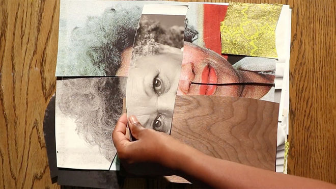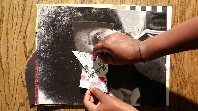 That is Mickalene working, putting the collage together. The video that she gave me was just the raw footage of her working. It was all one position, the horizontal landscape position, filling the screen. I spent time thinking about how that would work. I edited it and this is what emerged.