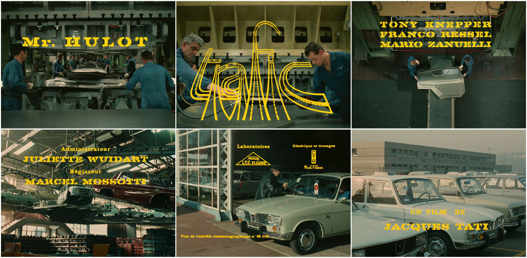 The mechanized opening of Jacques Tati’s 1971 film Trafic has a strangely calming quality to it. Despite being set on a noisy factory floor filled with massive machines and working men, the film’s title sequence is an orderly and deliberate affair, much like the vehicle assembly line at its centre.
