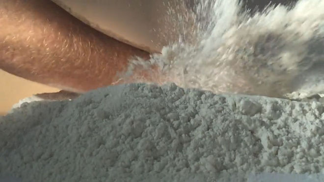 Alan: On a Sunday afternoon I was in the office trying to find a visual solution and I walked into the kitchen and found a pound of flour and brought it into our shoot space. I propped up my iPhone and shot my hand slamming down into the powder at 240 fps. As I watched the vibrations send the flour flying, I began to see a visual language for impact in an interesting way.
