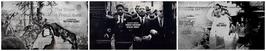 The title sequence to the documentary, designed by Manija Emran at The Mill, breathes fire into black and white photography, weaving parallels between disparate images of the human spirit in revolt. The sequence sets up a graphic language that acts as backbone for the film, a grounding element between chapters, that burns through the strata of time and place and insists upon uprising as universal language. No revolution is an island.