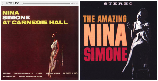 Image Set: Nina Simone album covers used as inspiration. The Amazing Nina Simone was her first album, released in 1959, and Nina Simone at Carnegie Hall was recorded live at her first solo appearance at Carnegie Hall in New York, on April 12, 1963.