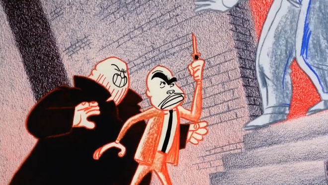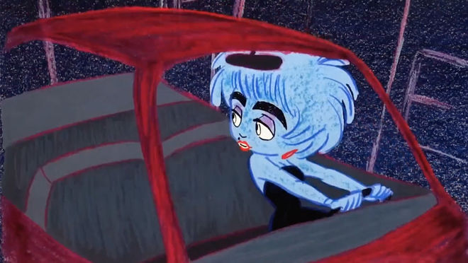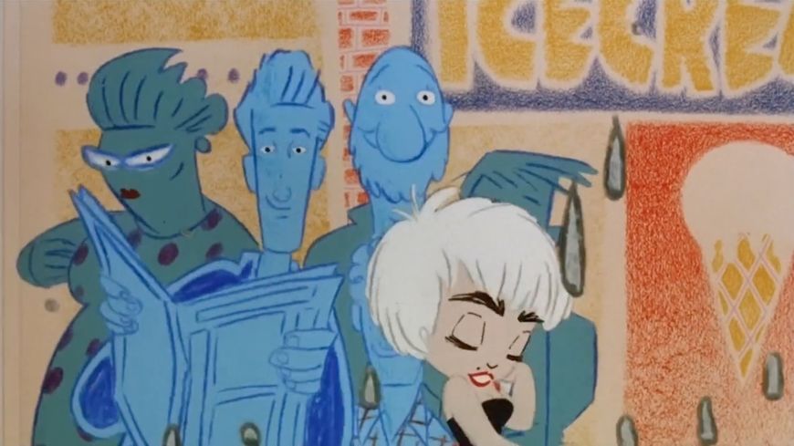 The entire opening sequence, set to Madonna's catchy ’80s groove “Causing a Commotion,” animates the events leading up to Nikki Finn's arrest, a swinging key at the end dissolving into the one in her jail cell. The freneticism and overall anarchy of the main character is captured by the equally chaotic artwork in which the colours don't always fill in (if they are coloured at all) and the seams make the odd appearance. While the bobble-headed vixen at the center is clearly formed, everything around her seems to fall apart, much like it does in the film. Sketched in grease pencil, per cameraman Glen Claybrook, "This gave it a vibrant, sketchy feel, sort of like old xerography animation." Director James Foley came up with the idea for an animated intro, Madonna wrote the song for it, and late Argentinian artist Daniel Melgarejo conceived the bobble-headed commotion-causing babe. "He did some sketches and just thought he caught the energy of Nikki Finn," Foley says. "Love how his angular style matched the sonics of the song."