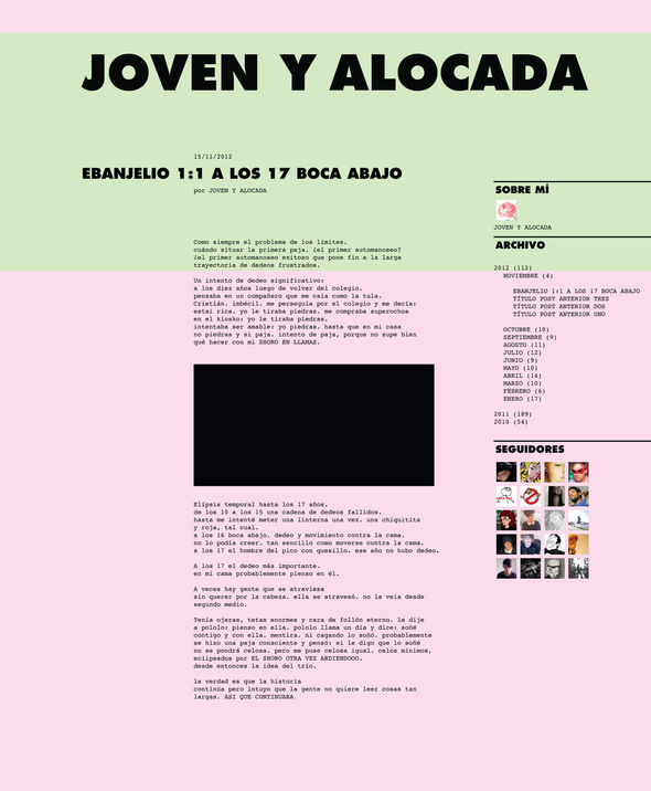 In Marialy Rivas’s 2012 film Joven y Alocada (Young and Wild), the blog acts as backbone to young Daniela’s spirited and saucy narrative. When the film ends, the frame is swathed in a soft rose and we scroll ever downward through the teasing end credits. We are gently pulled along and tempted into participating with flashes of animated sensuality: a breast here, a flaming crotch there, and all the while, this dreamy electro-pop ballad lulls us into delighted submission. So we watch, hoping for more, chunks of Courier New adorning the less rousing portions, when finally, there it is – one last, ejaculatory hurrah.