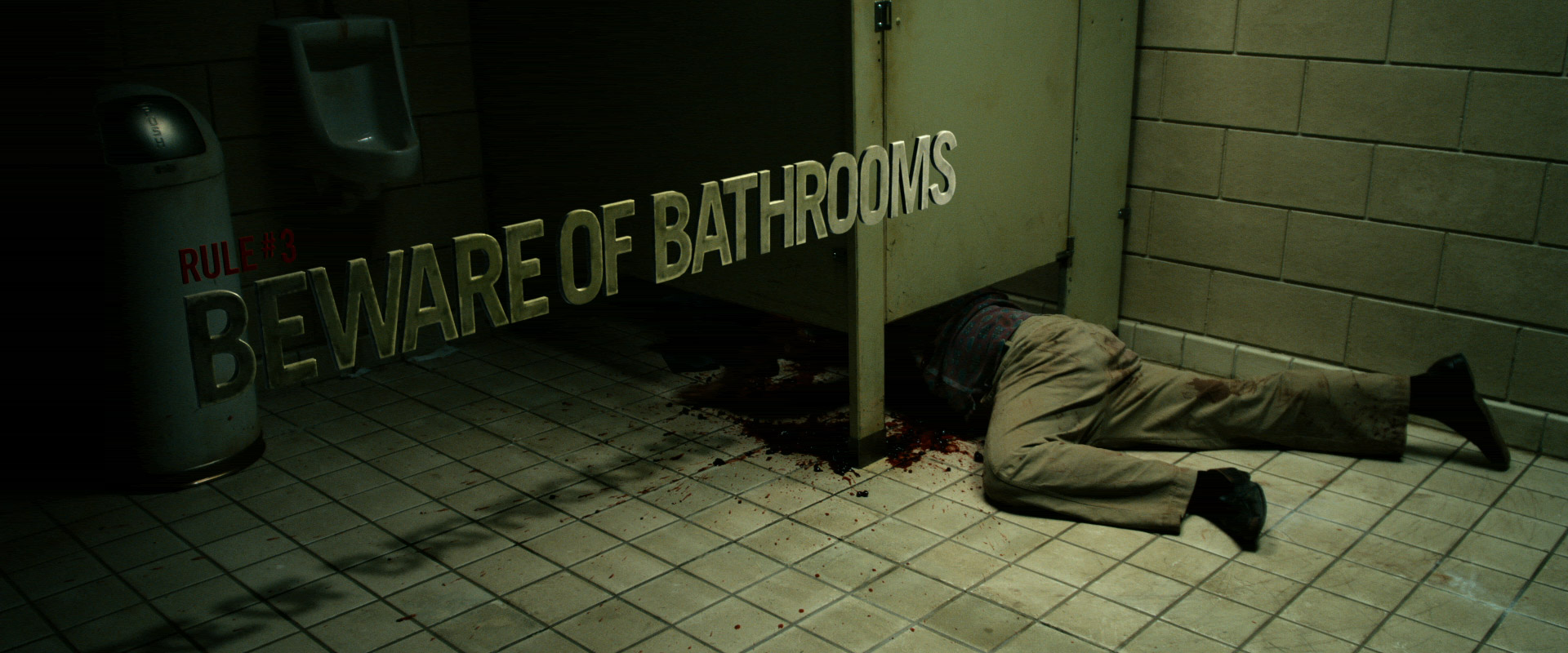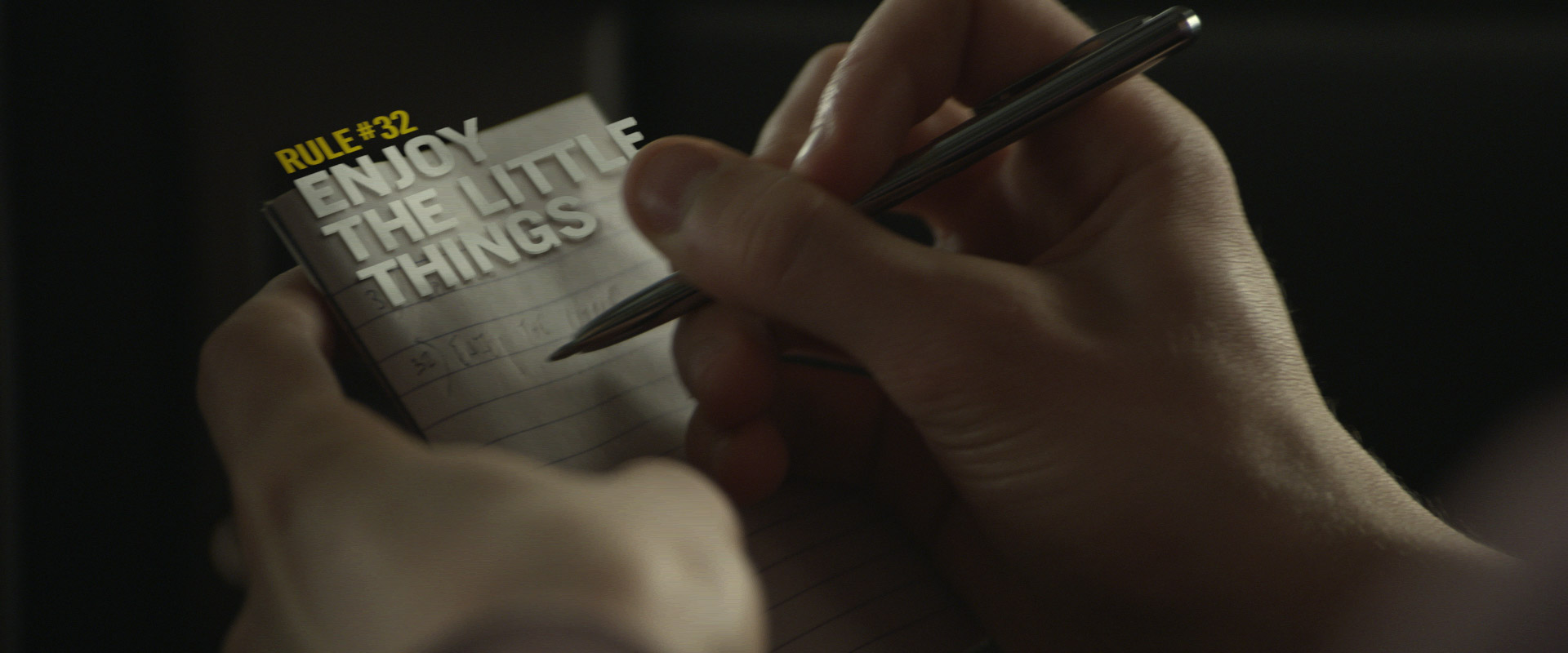 The “rules” were constructed to be an onscreen punctuation to the setups in the narrative. Technically the rules were created in Maya and textured and lit to match whichever scene the type would live.